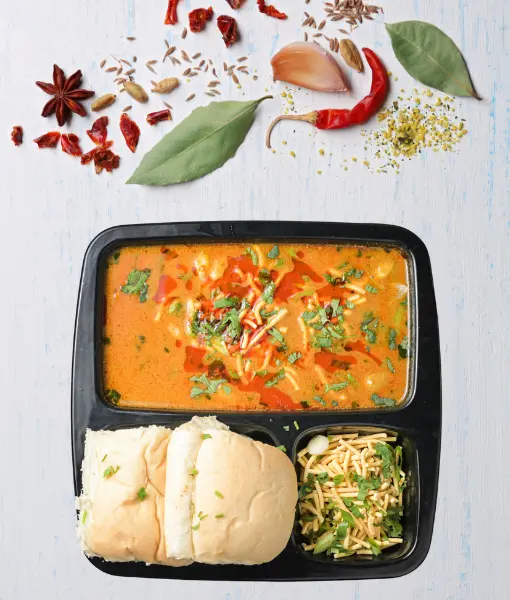 Spicy tomato-based curry topped with crispy sev — a Gujarati classic.